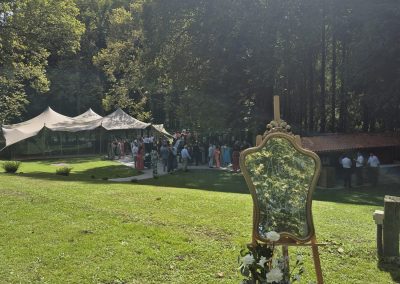 Contamos con espacios exteriores en medio de la naturaleza, con una arboleda espectacular, preciosa y cuidada, un río que corre en la parte inferior a los terrenos y la montaña a la vista. En esto espacios tenemos cabida para la boda al completo, desde la ceremonia, cóctel, banquete, fiesta y recena, con un aforo incalculable. En los exteriores, planteamos 2 espacios principales: